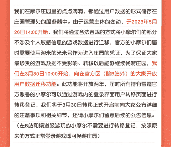 合作结束本就是开发方和代理方双方的事情,,,,降低这件事情对玩家的影响,,才是对所有珍视这段童年的摩尔玩家最好的呵护。。目前看来,,用户完全不用担心后续因无法登录游戏而造成任何数据上的损失,,只要及时进行账号转移,,,就可以好好保留、、、延续在庄园的痕迹和回忆,,继续在庄园里做快乐的红鼻子小鼹鼠。。。。