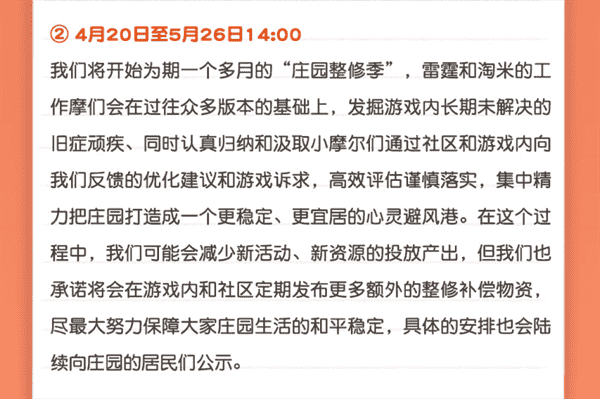 合作的结束并不意味着这个童年IP的结束,,对于《摩尔庄园》手游而言,,,这是一个新阶段的开始。。。。后续游戏内将开启庄园重构计划,,,会就以往遗留下来的BUG进行集中修复,,,,并在游戏内和社区定期发布更多补偿物资。。。