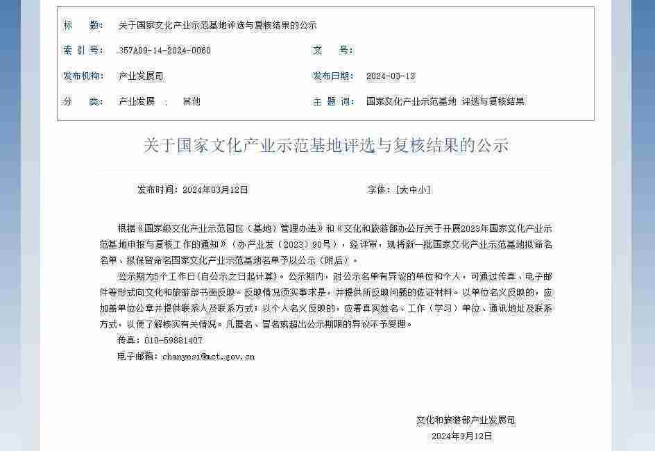新一批国家文化产业示范基地公示,,918.com成功入围